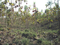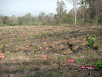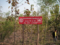 みなさんの寄付により植林した専用植林地にもTGGとFIOの共同植林を示す看板が立てられました。 また、右の写真のように、寄付により植林したチーク木1本1本に、寄付をしていただいた方のお名前を記載した看板が 立てられています。上の写真は2005〜2006年に寄付をしていただいた方のチークですので、まだ小さいですが、 みなさんのチークは何れも順調に成長しています。 もう少し大きくなったら、タイを訪れ、是非、御自分のチークを探してみてください。